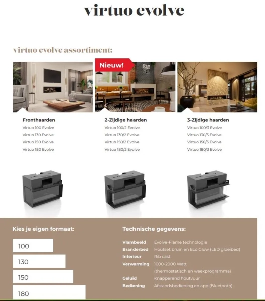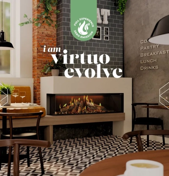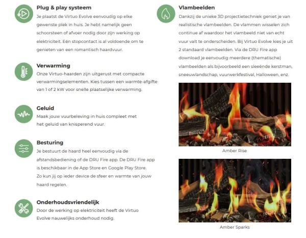 De unieke Evolve Flame technology -met opnames van echt houtvuur- in combinatie met het met houtsnippers gedecoreerde gloeibed zorgt voor een zeer realistische houtvuurbeleving. Daarnaast heeft de haard dankzij het warmte-element van 1 tot 2 kW ook een verwarmingsfunctie. Lage en brede afmetingen maken de haarden zeer geschikt voor de populaire cinewalls. Zo is de DRU Virtuo Evolve altijd een stijlvolle toevoeging aan uw interieur.
