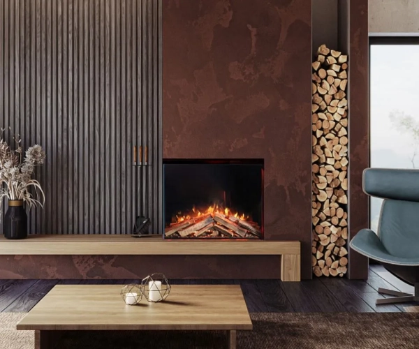 - Een echte houtset en een stijlvolle donker glazen achterwand.